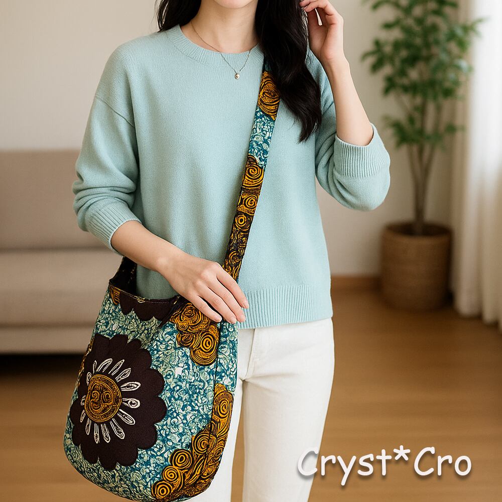 ※製品には多少の個体差があることがございますので、ご確認の上お使いください。洗濯やお手入れについての注意事項は、こちらのページをご覧ください。日常のお供として、このアフリカンファブリックのショルダーバッグをぜひお楽しみください!