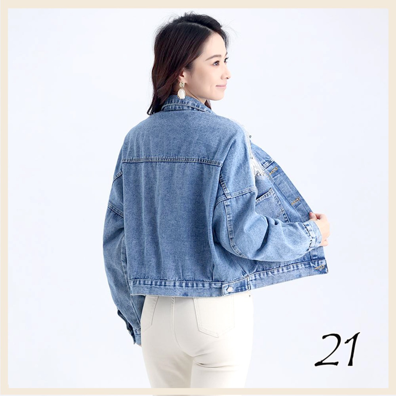 さあ、このデニムジャケットを身にまといましょう。大人の女性ならではの独自のスタイルを演出することでしょう。ライトアップされたビジューが周りの人々に羨望のまなざしを向けさせます。その想いを胸に、新たな冒険に出かけましょう。
